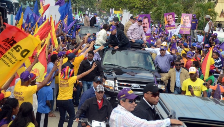 En la caravana desfila una gran cantidad de camioncitos, camionetas, carros y motores, con banderas moradas y amarillas. La gente se aposta en ambos extremos de las calles bailando al compás de la música promocional y saludando al candidato y presidente Danilo Medina, quién responde con una sonrisa y levantando las manos  en señal de aprobación.
