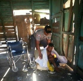 SAN JUAN DE LA MAGUANA:Un agente policial brinda su solidaridad a un enajenado mental a quien recientemente le fue amputada una pierna producto de una fuerte infección.