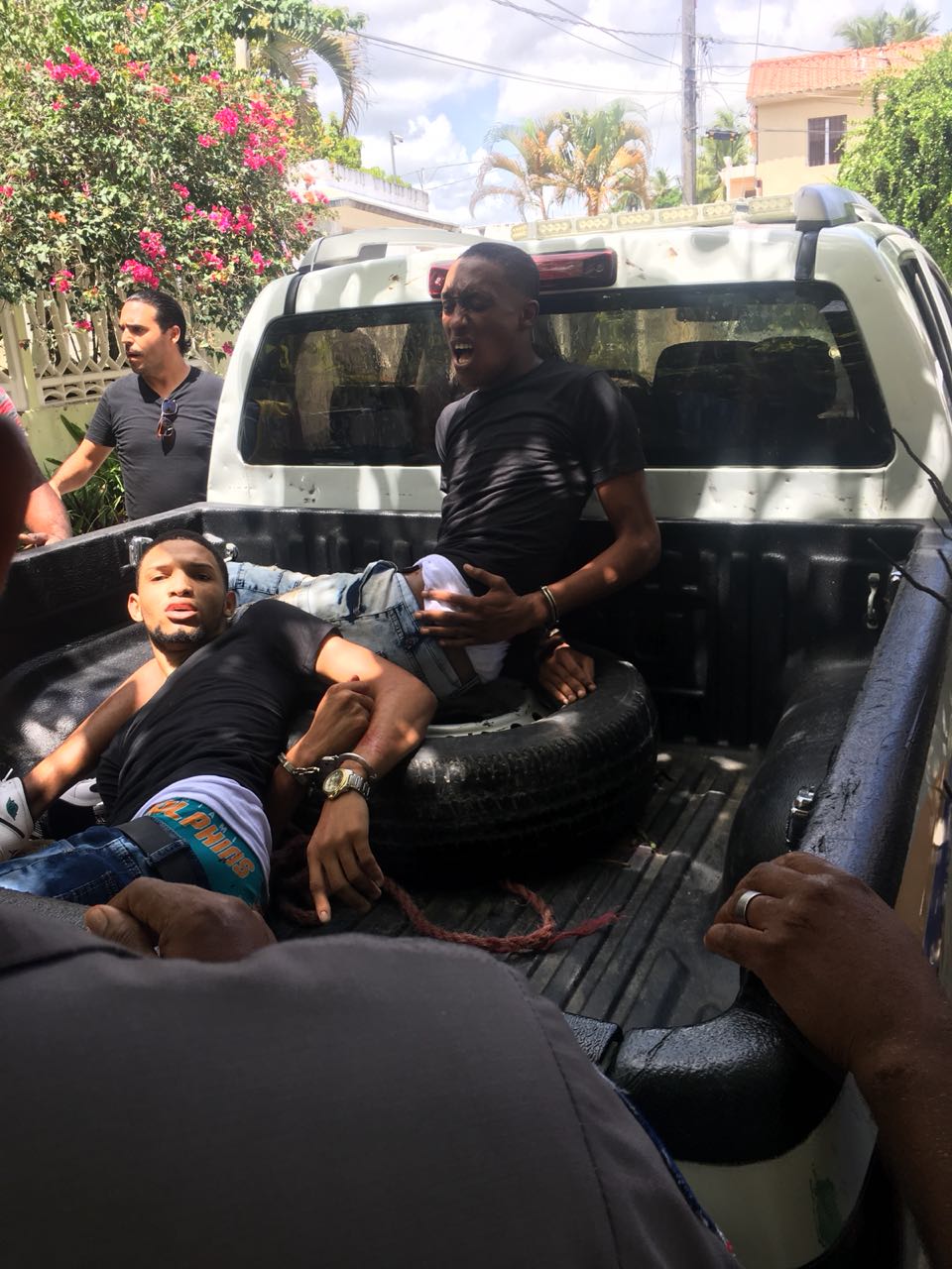 NAGUA.- Dos hombres resultaron heridos de bala y fueron detenidos durante un supuesto intercambio de disparos cuando, según la versión policial, fueron sorprendidos en casa de una mujer a quien habían raptado.